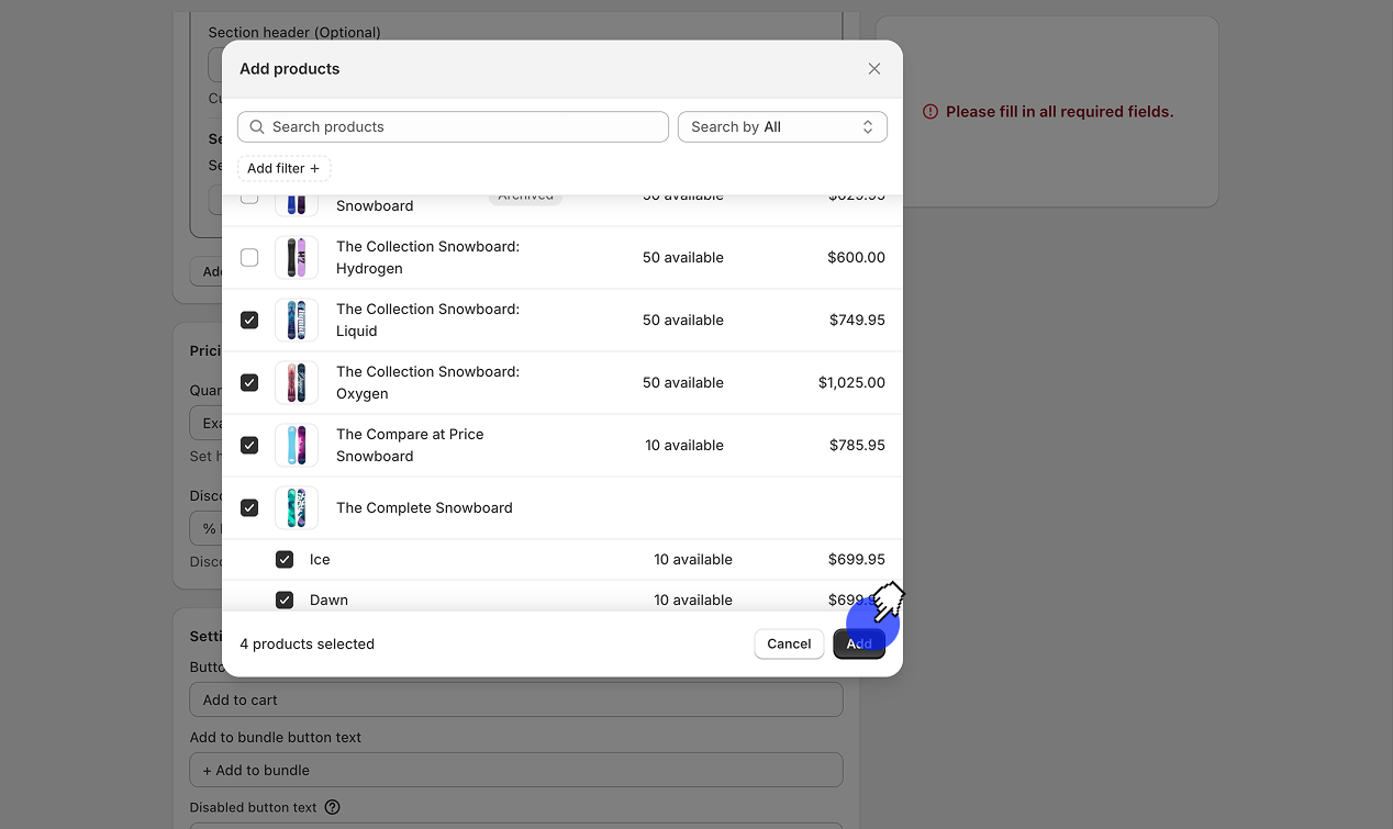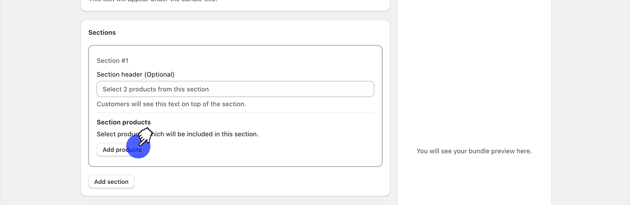 Scroll down to add products to your first section. You can add multiple sections if needed.