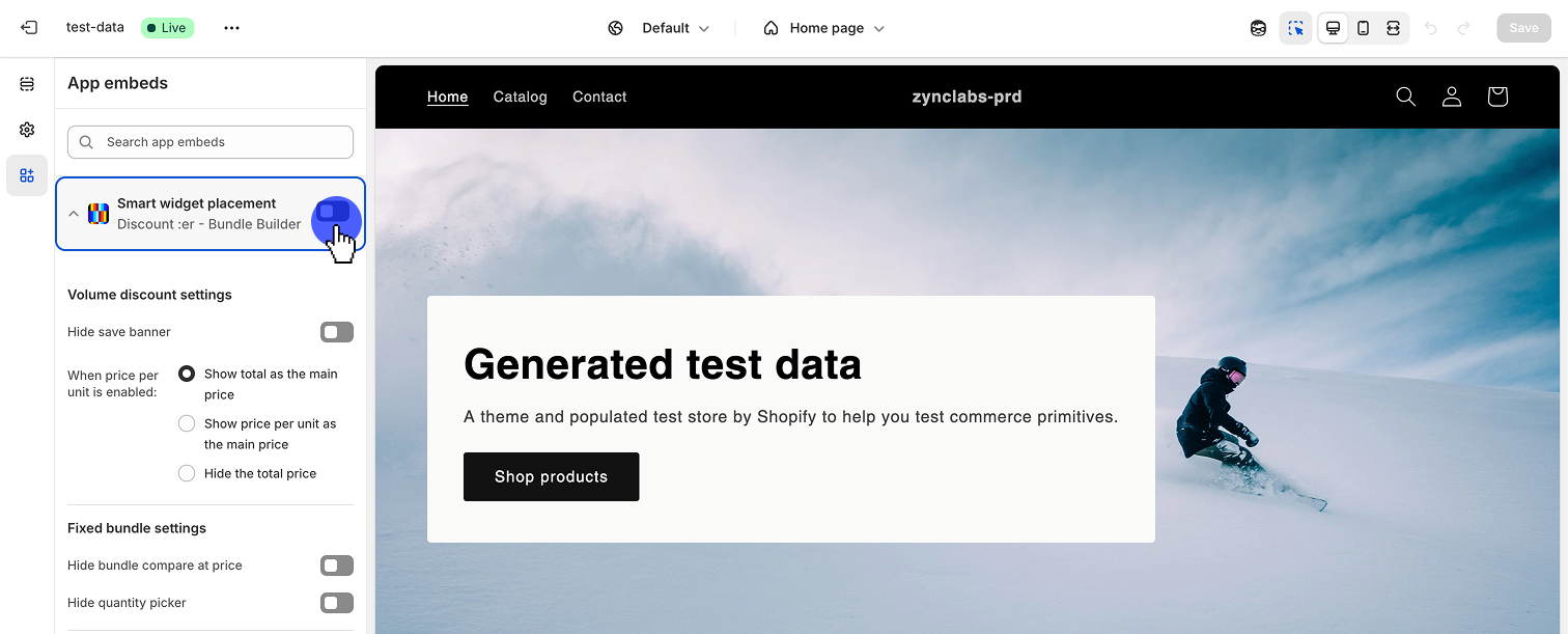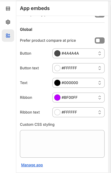 Head over to your theme app embeds section by clicking the link in the top banner. Or, open Themes > Customize theme > App Embeds.