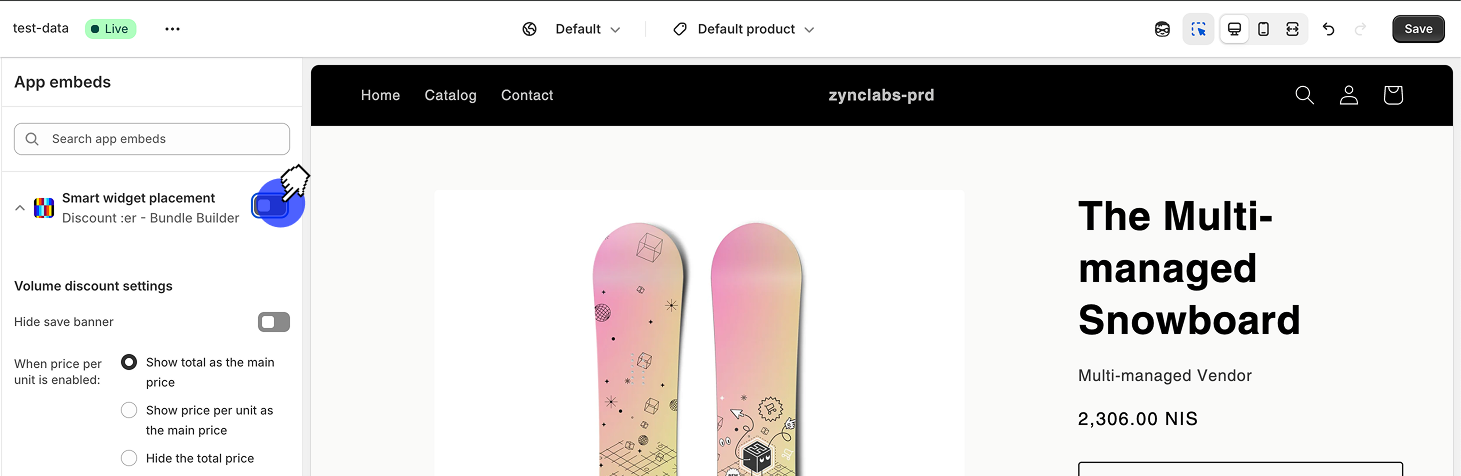 Head over to your theme app embeds section by clicking the link in the top banner. Or, open Themes > Customize theme > App Embeds.